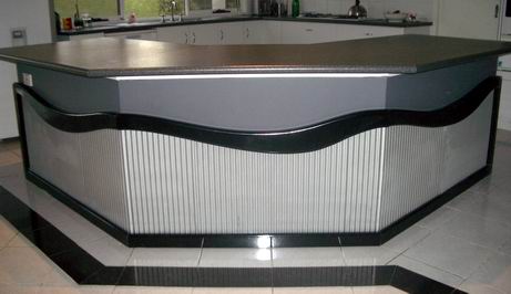 Timber elements can also be carved to create freeform curves as shown on the front face of this island bench to frame a corrigated iron kick panel.